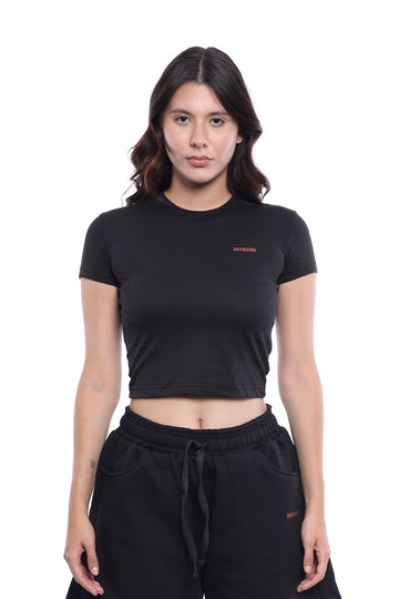 Pure cotton baby tee in classic black, a timeless base that sharpens any look.