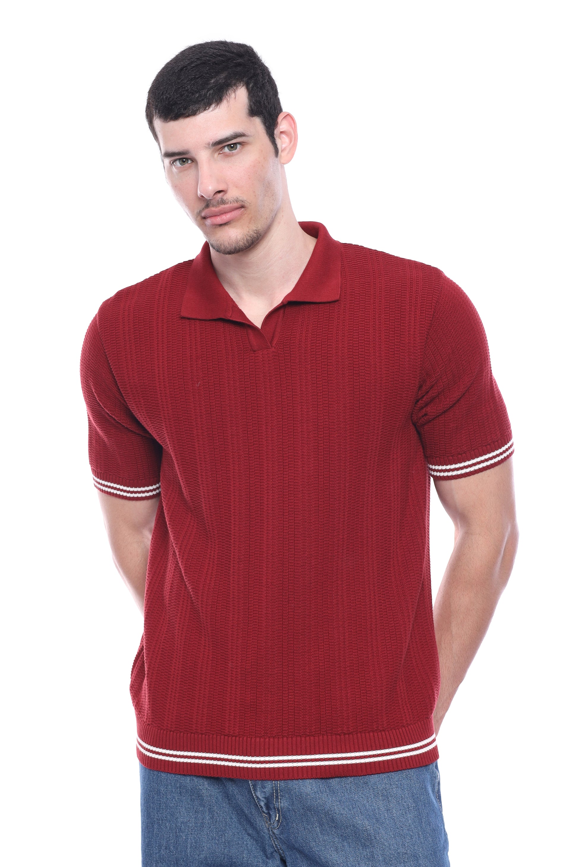 Add a pop of sporty sophistication with the Burgundy Knitted Polo Shirt. Crafted from soft, premium knit, it features clean white stripes on the sleeves and hem, giving it a relaxed, stylish vibe with a subtle edge.