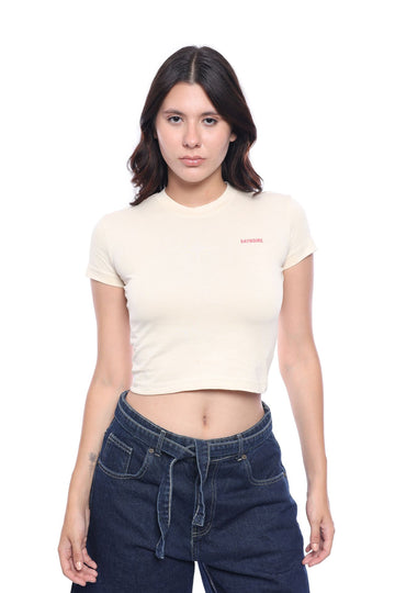 Pure cotton baby tee in a soft cream shade, carrying a calm neutral elegance.