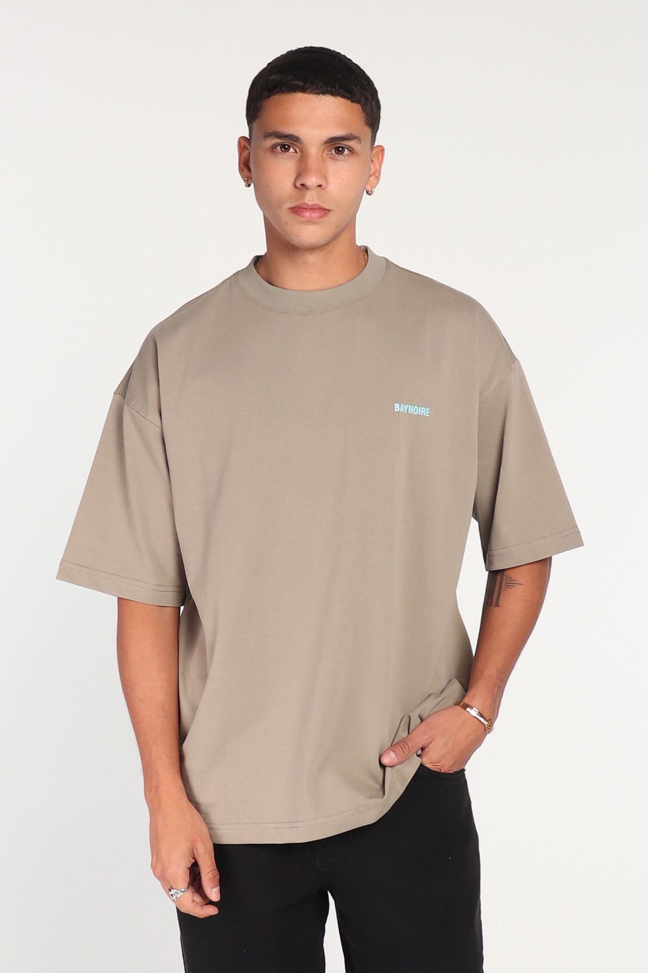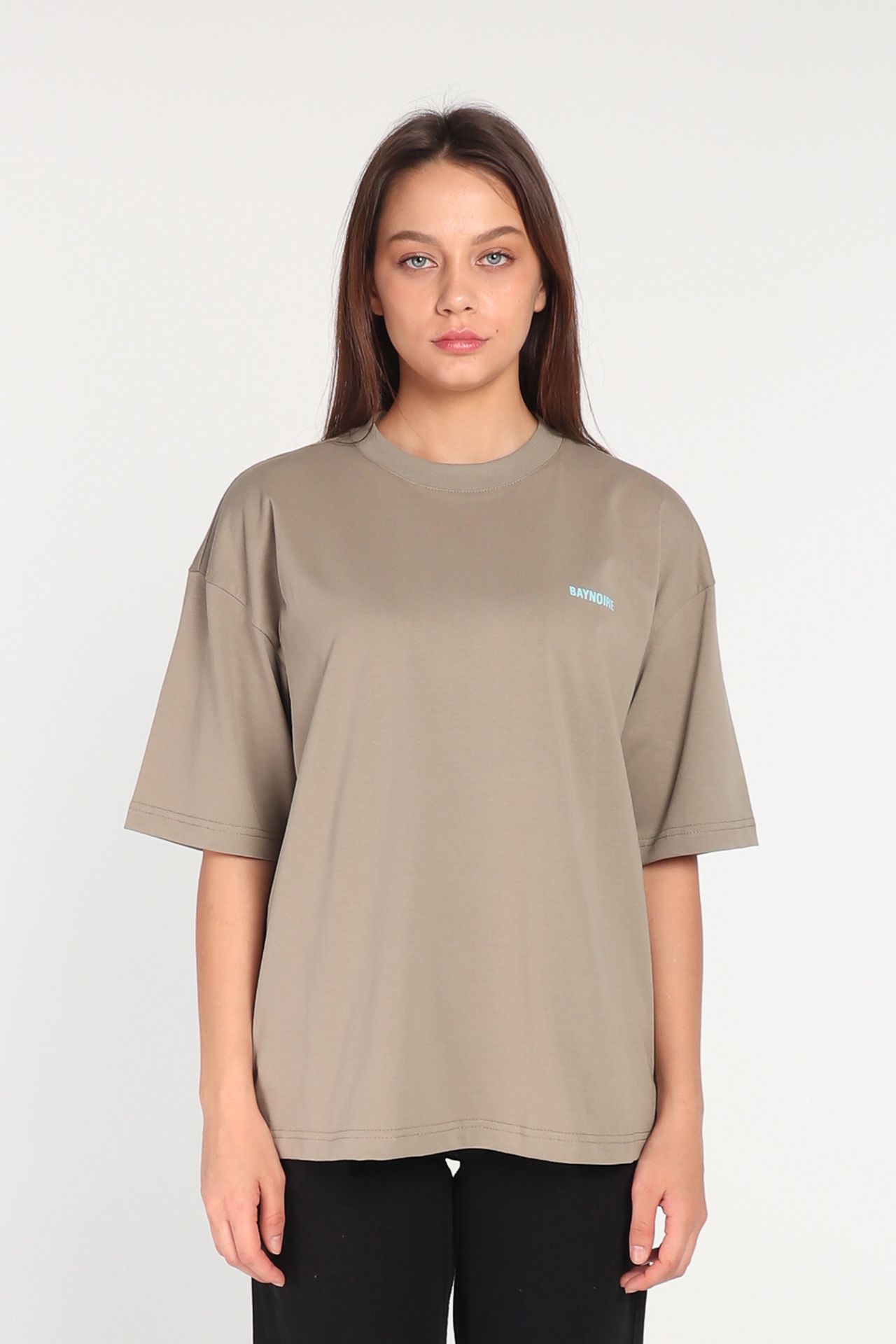 Pure cotton oversized T-shirt in a shade inspired by the muted elegance of olive-grey feathers. Features the Baynoire logo placed on the front,